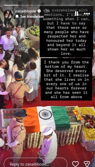 जनाई भोसले ने अपने इंस्टाग्राम स्टोरी पर लिखा, “जब भी मुझे मौका मिलेगा मैं कुछ जरूर लिखूंगी, लेकिन मुझे यह कहना ही होगा कि आज और उसके बाद भी इतने सारे लोगों ने उनका सम्मान किया, उन्हें आदर दिया और सबसे बढ़कर, उन पर इतना सारा प्यार बरसाया। मैं अपने दिल की गहराइयों से आप सभी का शुक्रिया अदा करती हूं। वह इस सब की पूरी तरह हकदार थीं। मुझे इस बात का एहसास है कि वह हम सभी के दिलों में हमेशा जिंदा रहेंगी, और वह ऊपर से यह सब देख रही हैं।”