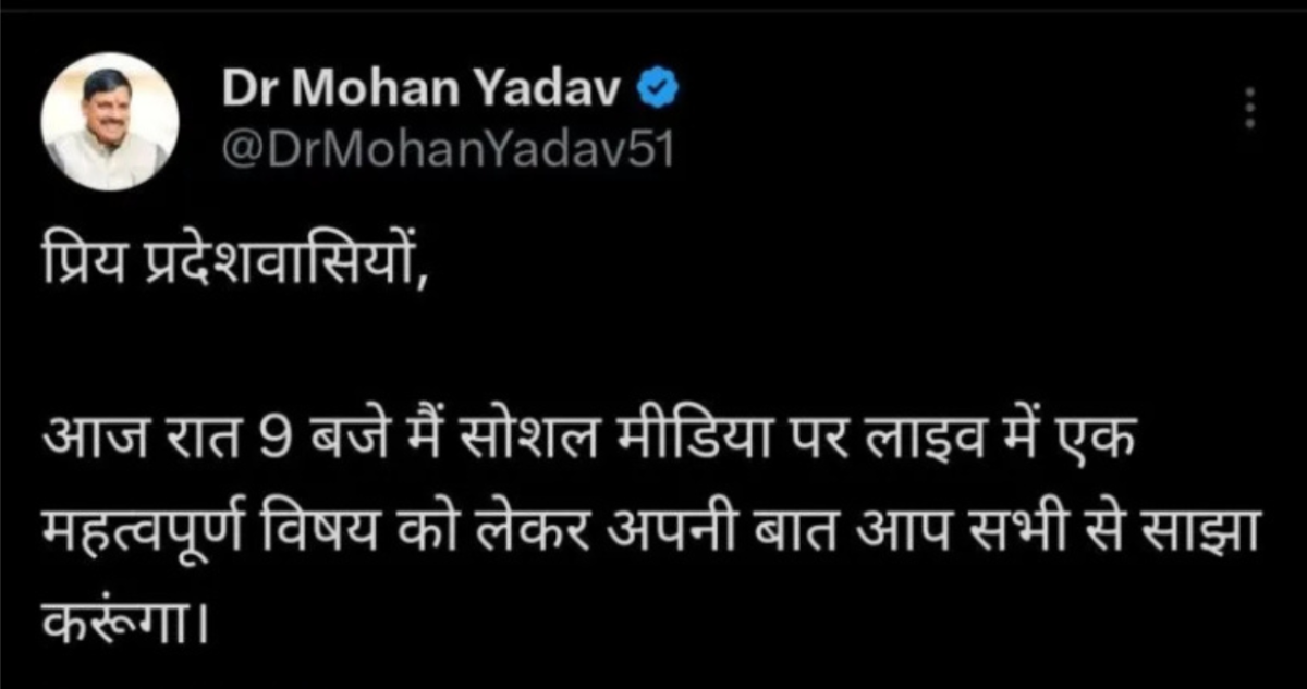 डॉ. मोहन यादव ने सोशल मीडिया पर पोस्ट कर जानकारी दी – “प्रिय प्रदेशवासियों, आज रात 9 बजे मै सोशल मीडिया पर लाइव में एक महत्वपूर्ण विषय को लेकर अपनी बात सभी से साझा करूंगा”